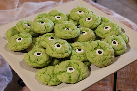 Monster Cookies. Really easy and yummy. The eyeballs are candy eyes from JoAnn. I use the recipe from lilluna.com for Gooey Monster Cookies. The only change I would make from their recipe, is I roll them in granulated sugar instead of powdered sugar. The powdered sugar gives them a white-ish covering on parts of the cookie, and takes away from the look I want. Suit yourself, though. Both are equally delish!